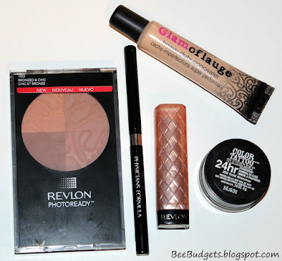 | Hard Candy Glamoflauge in Light, Revlon Lip Butter in Creme Brulee, Physicians Formula Eyeliner in Black, Maybelline Color Tattoo in Gold Shimmer, Revlon PhotoReady Bronzer |